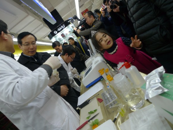 安博儀器的檢測(cè)人員切取樣品放入試管中,然后注入一種透明液體。“這是緩沖液,是檢驗(yàn)農(nóng)藥殘留的試劑。”檢測(cè)人員說(shuō)。